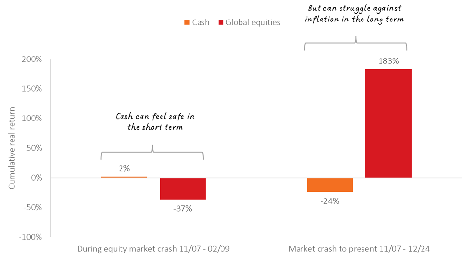 The first hurdle that people face is whether to invest at all. For those who are inexperienced investors, or who have suffered a bad initial foray into markets, it can be hard to step away from the sense of safety that a bank deposit provides. In the short term, cash can feel comfortable, but it has a terrible track record of maintaining or growing purchasing power – i.e. the amount of goods or services your money can buy - over time for investors. For us, that makes it a risky strategy. The chart below demonstrates how cash performed during the Global Financial Crisis (2007-2009) and how it has performed since then, compared to world equities (developed and emerging). Over the whole period, 24% of cash’s purchasing power has been eroded, whilst the purchasing power of ‘higher’ risk equities more than doubled, even when measured from the height of the market before the fall.